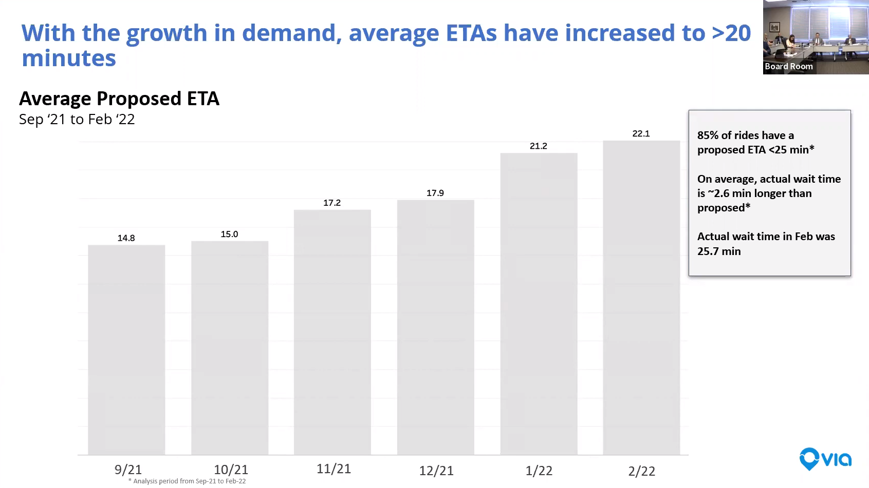 For people who are able to book a ride, average wait times have increased well beyond Via’s original estimate of 10-15 minutes. In February 2022, the average actual wait time for passengers was 25.7 minutes. These wait times do not include the amount of time passengers spent waiting for a seat to become available so they could book a ride.