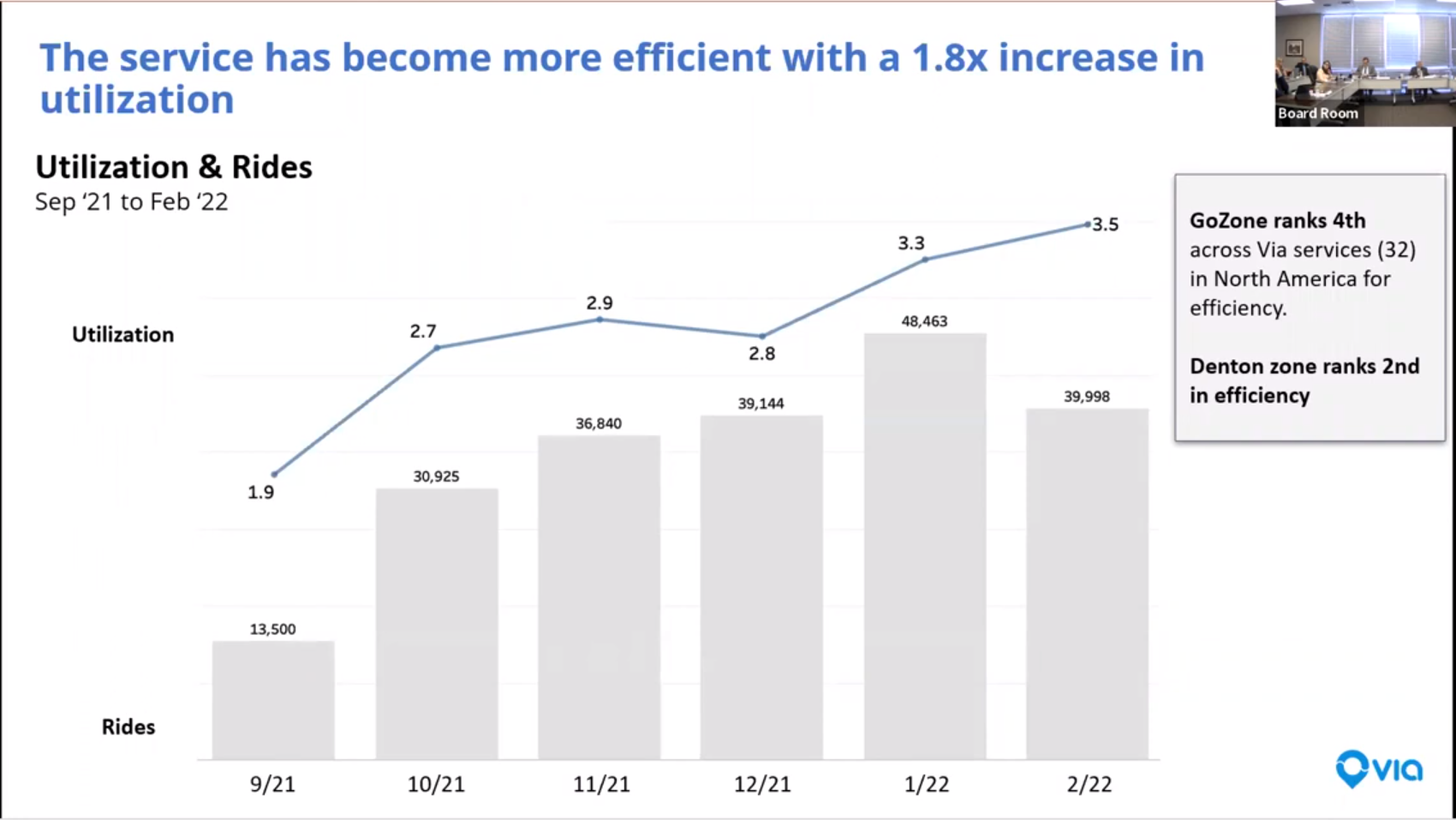 In a presentation to the DCTA Board on March 24, 2022, Via shared that GoZone carried 2.7 to 3.5 passengers per vehicle service hour between October 2021 and February 2022.