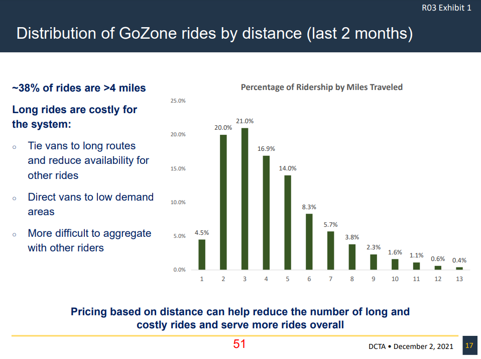 Lengthy trips are one factor that has reduced GoZone’s efficiency. In October and November last year, DCTA found that approximately 34 percent of all GoZone trips were longer than four miles. Longer trips make the system less efficient by reducing availability for other riders and directing the vans to lower-demand areas.